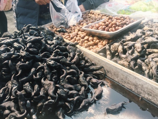 蚰蜒,即墨特產(chǎn),樣子像是釣魚用的魚蟲,味道鮮美,因?yàn)椴荒苋斯ゐB(yǎng)殖,價(jià)格不低。蚰蜒炒雞蛋吃的當(dāng)?shù)刈钕矏鄣囊环N吃法。ps,小編沒敢品嘗,據(jù)同伴說肉質(zhì)鮮嫩···