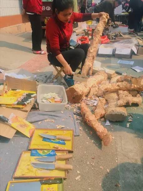 大姐在賣刀,大個(gè)的木頭做道具,讓人們看看這刀的鋒利。