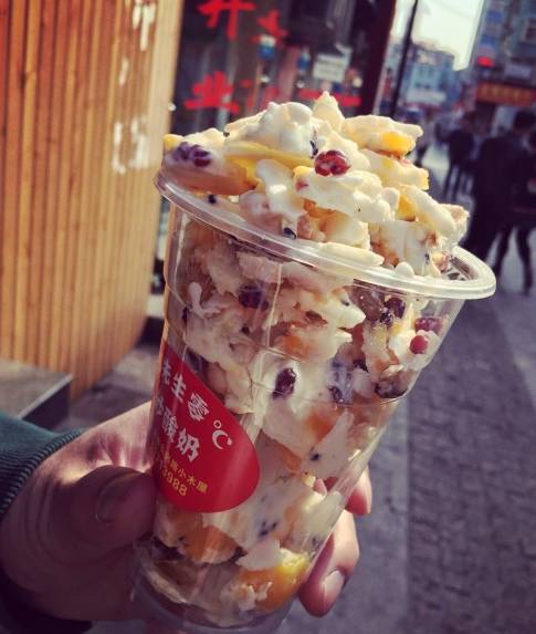 只有一個(gè)小窗口,可以看見里面炒酸奶的全過程哦!店里有兩種酸奶,一種是原味的,一種是莫斯利安酸奶,里面放了很多紅豆,葡萄干,花生碎,芝麻等等的,吃起來(lái)特別香特別爽,和冰淇淋相比,熱量低很多,所以非常適合減肥的妹子!