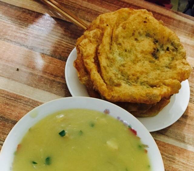青島港上有名的早餐,聽說(shuō)每天都要排很長(zhǎng)的隊(duì),風(fēng)雨無(wú)阻!餡餅有蘿卜跟肉餡兩種、肉餡比較有味道,提前腌過的,蘿卜就比較清淡一些~甜沫很濃厚,這點(diǎn)給贊。里面有花生仁,豆腐干,肉,還有菜葉子,配著餡餅,非常帶勁。