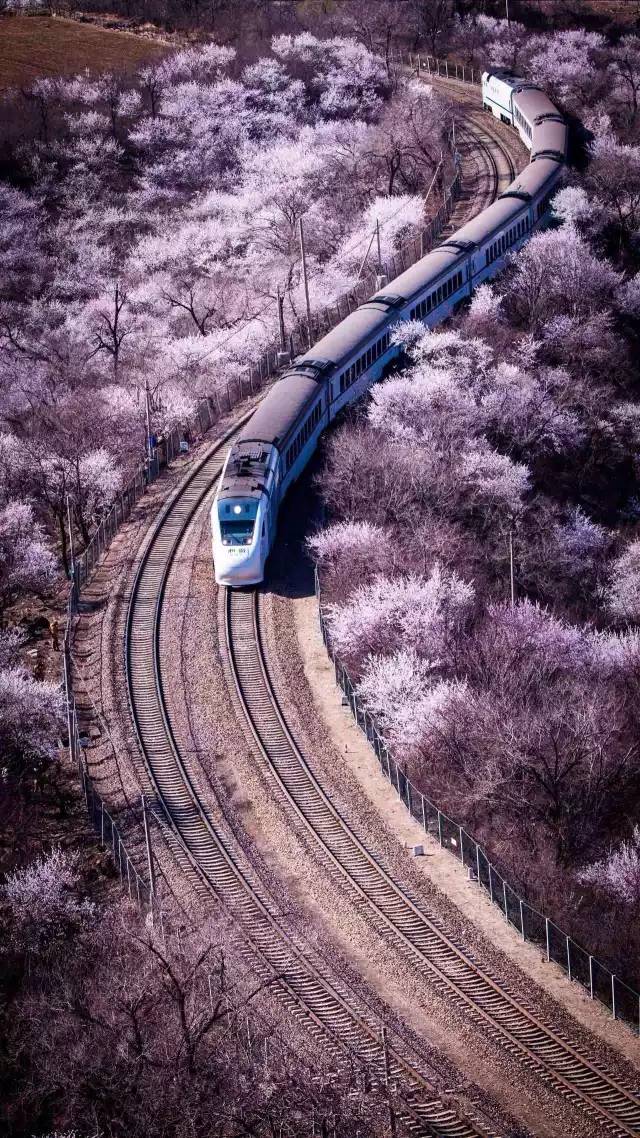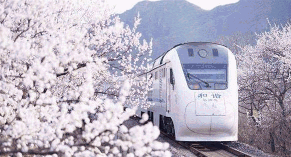 北京有一趟穿越居庸關(guān)的和諧號列車,鐵路兩旁及山間開滿櫻花,白色的列車如一條“長龍”,美到驚呆!