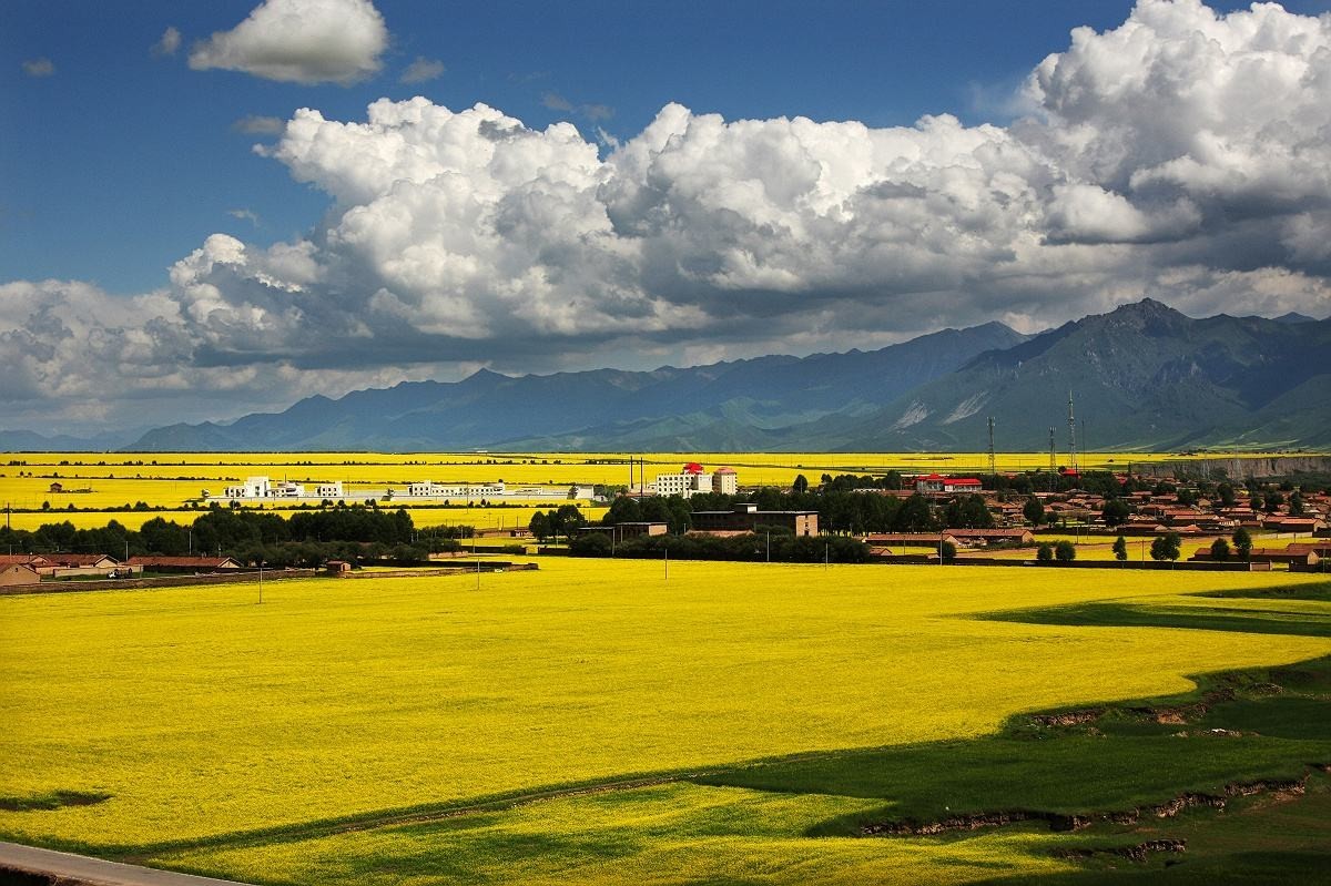 貴德黃河水清藍(lán),民和桃花紅艷艷,油菜花海香門源,天境祁連牛心山。