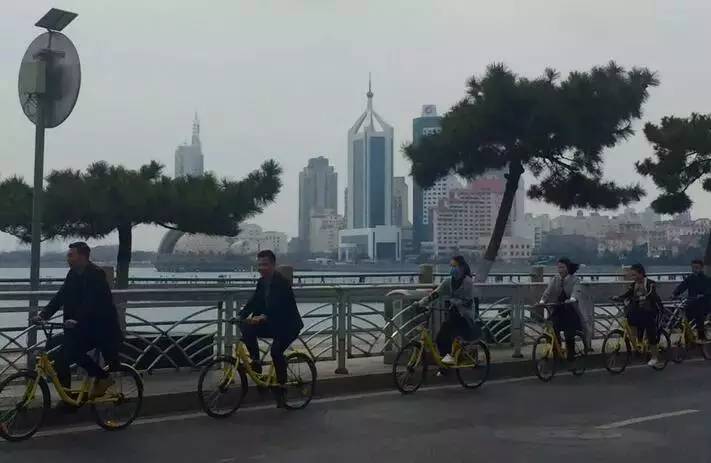 從昨天開始,島城出現(xiàn)一道風景線,一個個騎著黃色自行車的年輕人出現(xiàn)在各個地方。