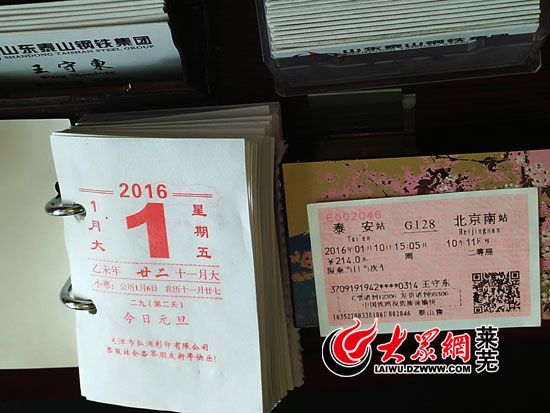 ????王守東辦公桌上準(zhǔn)備去北京參加會議的車票,而王守東的生命定格在了2016年1月1日(記者亓秀寶攝)