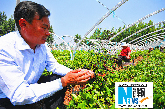 蘇慶亮生前在茶園察看泰山極頂茶生長(zhǎng)情況。