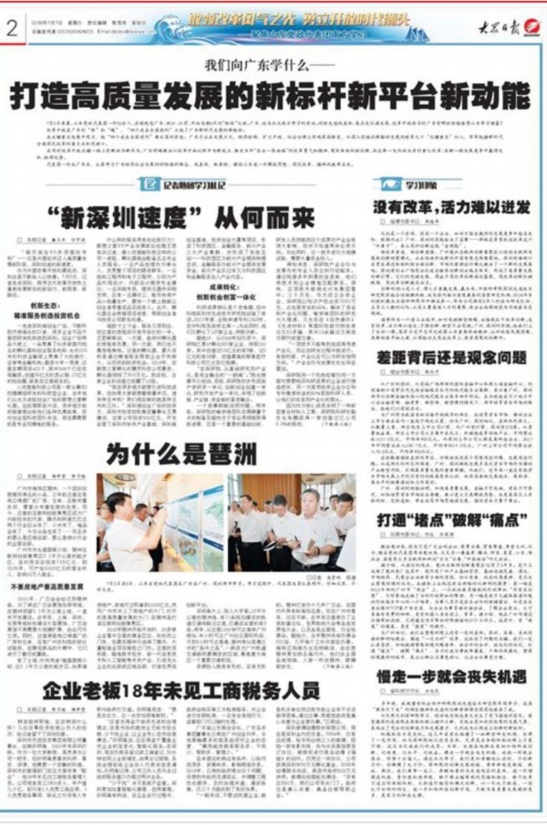 7月5日清晨,山東黨政代表團(tuán)一行50余人,啟程趕赴廣東、浙江、江蘇,開(kāi)始為期4天的“取經(jīng)”之旅。廣東,成為此次南方學(xué)習(xí)的首站。對(duì)標(biāo)先進(jìn)找差距,高點(diǎn)定位謀發(fā)展,改革開(kāi)放前沿的廣東有哪些經(jīng)驗(yàn)值得山東學(xué)習(xí)借鑒?