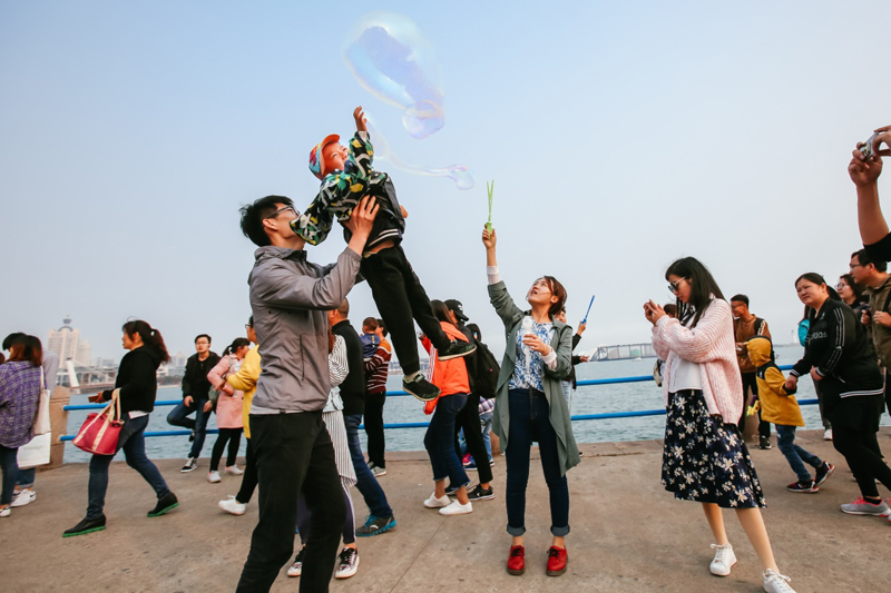 游客在青島五四廣場(chǎng)游玩(4月30日攝)。