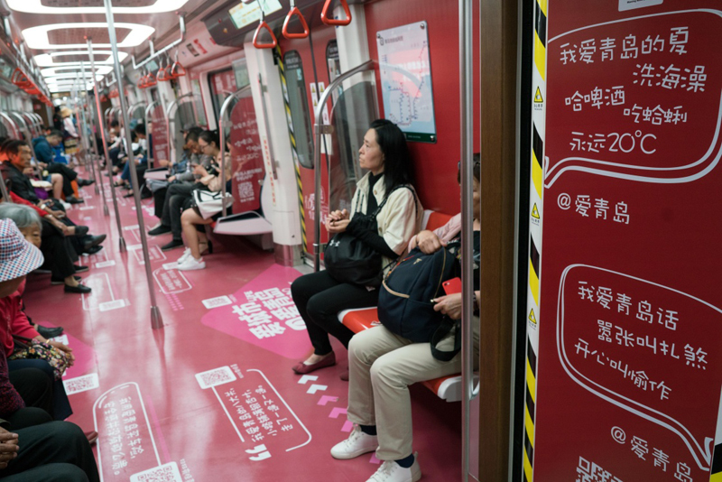 這是5月23日拍攝的帶有青島元素的地鐵車廂。