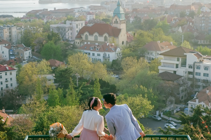 一對(duì)新人在青島信號(hào)山拍攝婚紗照(5月2日攝)。