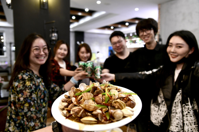 市民在一家餐館喝啤酒、吃蛤蜊(5月18日攝)。