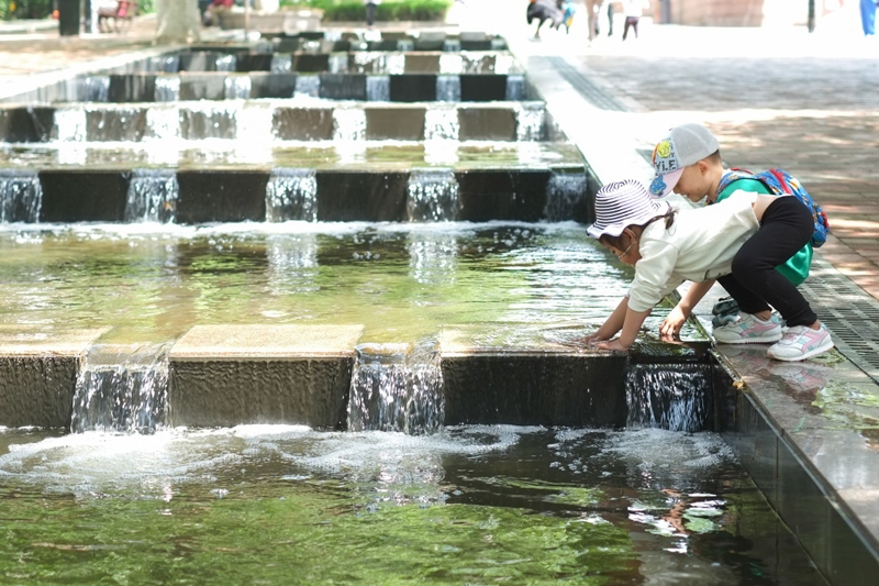 5月23日,小朋友在青島老舍公園戲水玩耍。