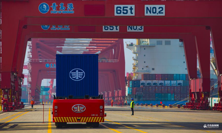 青島港全自動(dòng)運(yùn)輸車行駛中。