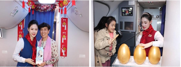 乘務組開展了“好運驚喜金花四射”活動,抽取幸運旅客上前砸金蛋,旅客滿懷期待卯足了勁將金蛋打開,笑容溢于言表。幸運旅客劉先生表示:“大概有一年沒回家了,說起來很慚愧,工作忙,家又遠,今年父母正式退休了,終于有機會帶二老出門旅游,很感謝山航準備的精美禮品,很驚喜,很貼心?!?/p>