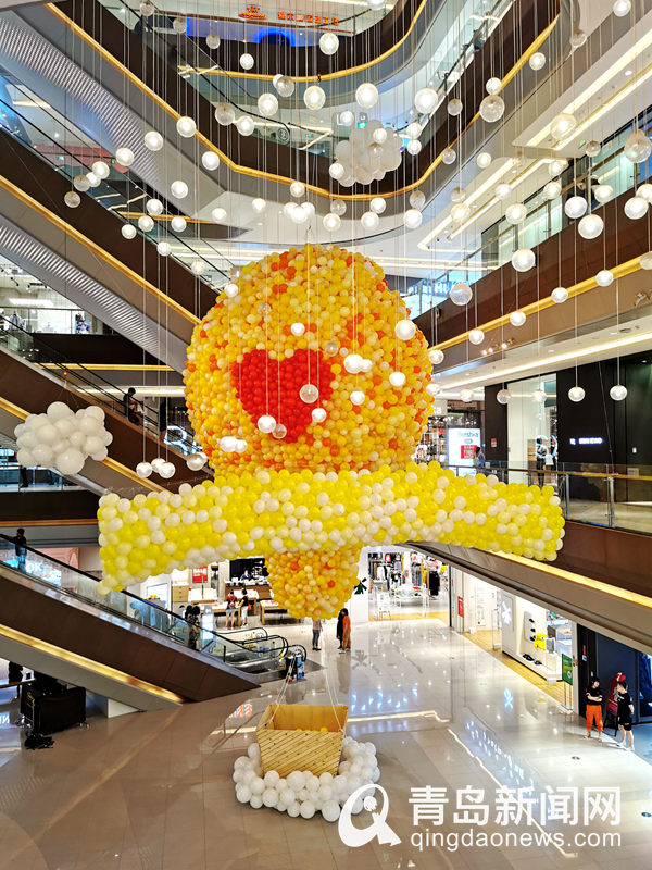 凱德mall用氣球搭建了一個3層樓高的熱氣球美陳,配合云朵和球形吊燈掛飾,制造出夢幻之感。