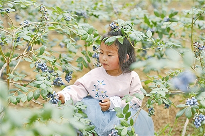 ▲一位小朋友在西海岸新區(qū)藍(lán)莓種植基地內(nèi)采摘。