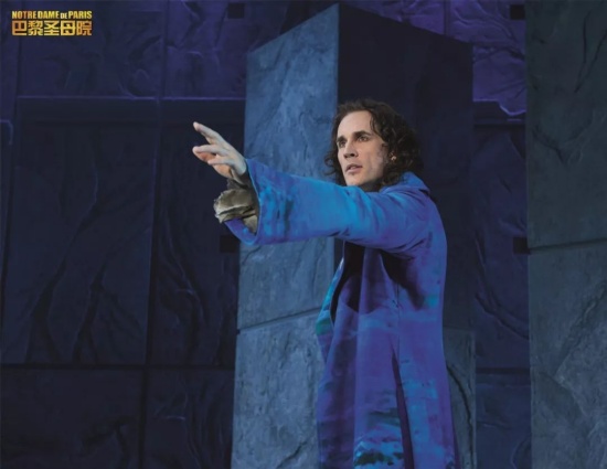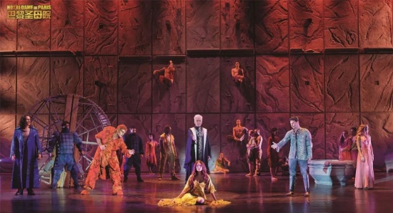 但仔細(xì)觀察即可發(fā)現(xiàn),法語(yǔ)音樂(lè)劇中將歌舞分離的處理十分明顯:唱歌的演員不參與舞蹈表演。服裝、化妝、舞臺(tái)背景設(shè)計(jì)都走現(xiàn)代化的路線,抽象簡(jiǎn)約但又展現(xiàn)了圣母院的滄桑,角色的性格。在舞臺(tái)上大量使用光影特效與威亞特技,增強(qiáng)了關(guān)鍵劇情的張力。