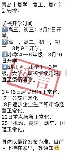 近日,網(wǎng)上流傳一份“青島市中小學復學計劃安排”,經(jīng)向青島市教育局核實,該計劃安排內容不屬實。目前教育部和山東省教育廳均未發(fā)表關于復學的計劃安排。