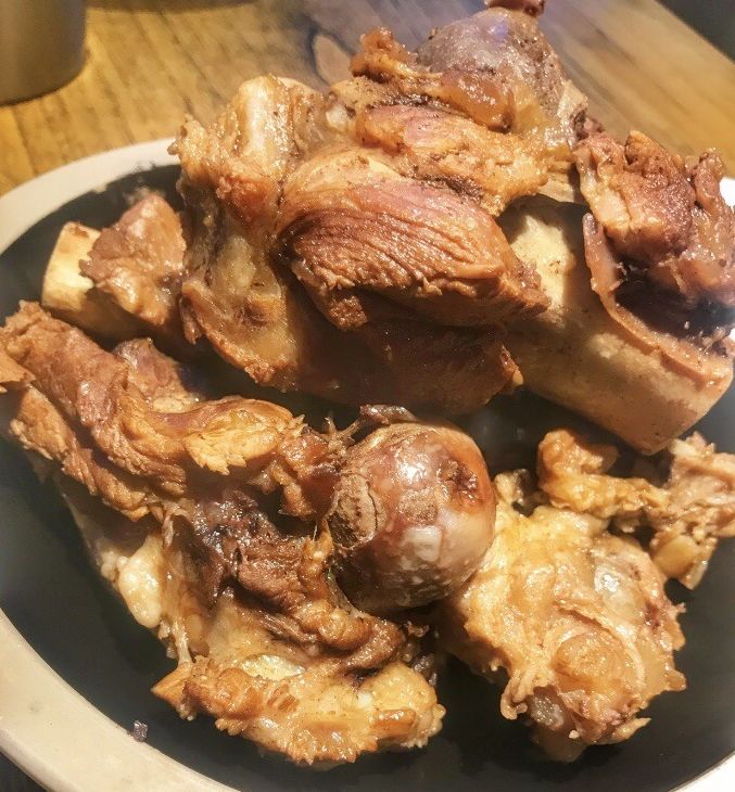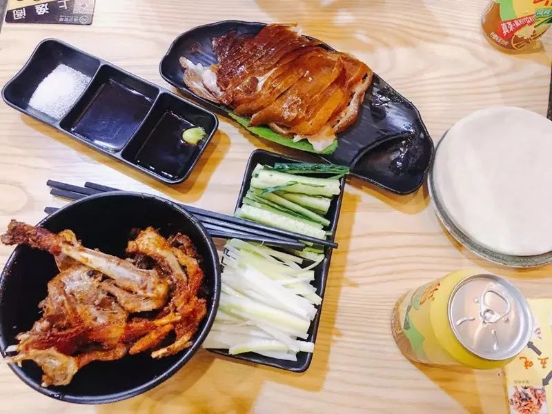 每次排隊(duì)的人都超多,胃口小的兩個(gè)人吃半套鴨子正好。鴨肉、黃瓜條、蔥段,再蘸上甜醬包在一起吃,油而不膩。炸鴨架酥脆可口,特別香!?。?/p>