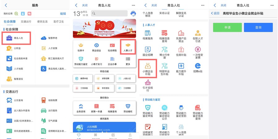 高校畢業(yè)生小微企業(yè)就業(yè)補(bǔ)貼標(biāo)準(zhǔn)每人每月400元,自首次申領(lǐng)補(bǔ)貼月份起36個月內(nèi)可享受補(bǔ)貼。以往符合條件的畢業(yè)生可登錄“青島人才網(wǎng)”申請?,F(xiàn)在,補(bǔ)貼申請又添新渠道。申請人可在“愛山東·青e辦”APP內(nèi)的青島人社應(yīng)用內(nèi)直接申請。首先,在“愛山東·青e辦”APP“服務(wù)”詳情頁找到社會保障分類下的“青島人社”應(yīng)用;然后,在應(yīng)用詳情頁的“人事人才”欄目下,找到“小微企業(yè)補(bǔ)貼”模塊,進(jìn)入詳情頁后根據(jù)要求填寫信息后提交補(bǔ)貼申請。申請完成后,還可點(diǎn)擊查詢按鈕,進(jìn)行已申請的補(bǔ)貼項(xiàng)目信息查詢。